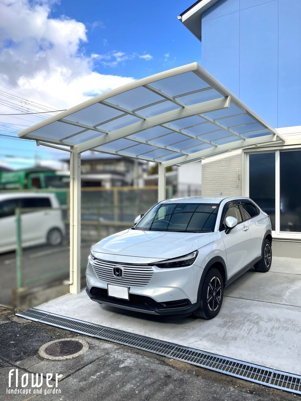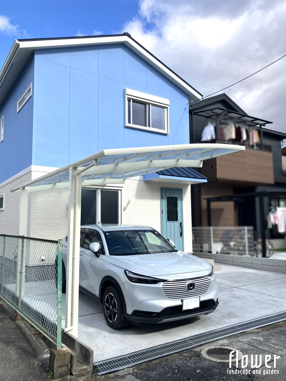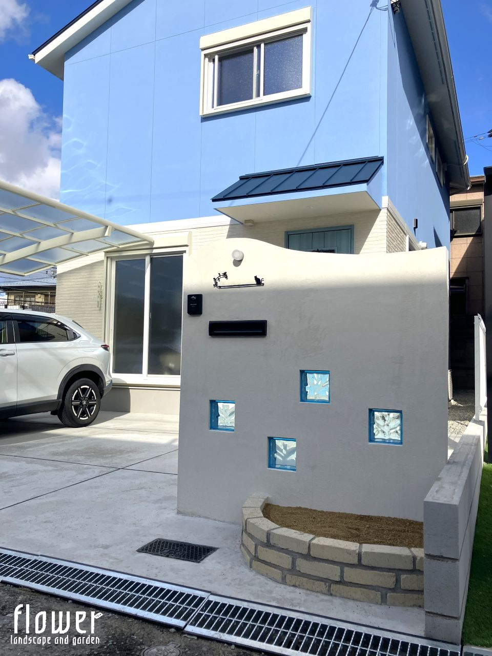 | コメント | ガラスブロックを埋め込んだ門柱は、 上部を波型にカットし 軽やかな曲線が印象的なデザインに。 門柱前には植栽桝を設け、 外構にやわらかな彩りと立体感をプラスします。 爽やかな色彩と透明感のあるガラス素材で、 ブルーの住宅の個性が際立つ マリンテイストの外構が完成しました。 【使用部材】 ・ポスト:LIXIL エクスポスト S-1型 ・メッシュフェンス:LIXIL ハイグリッドフェンスUF8型 ・カーポート:LIXIL ネスカR 1台用 ・塗装仕上げ:アイカ工業 ジョリパット ・レンガ:ユニソン ソイルレンガ210 ・ガラスブロック:オンリーワン クリスタルマリンブルー1910 ・300角タイル:LIXIL グレイスランド |