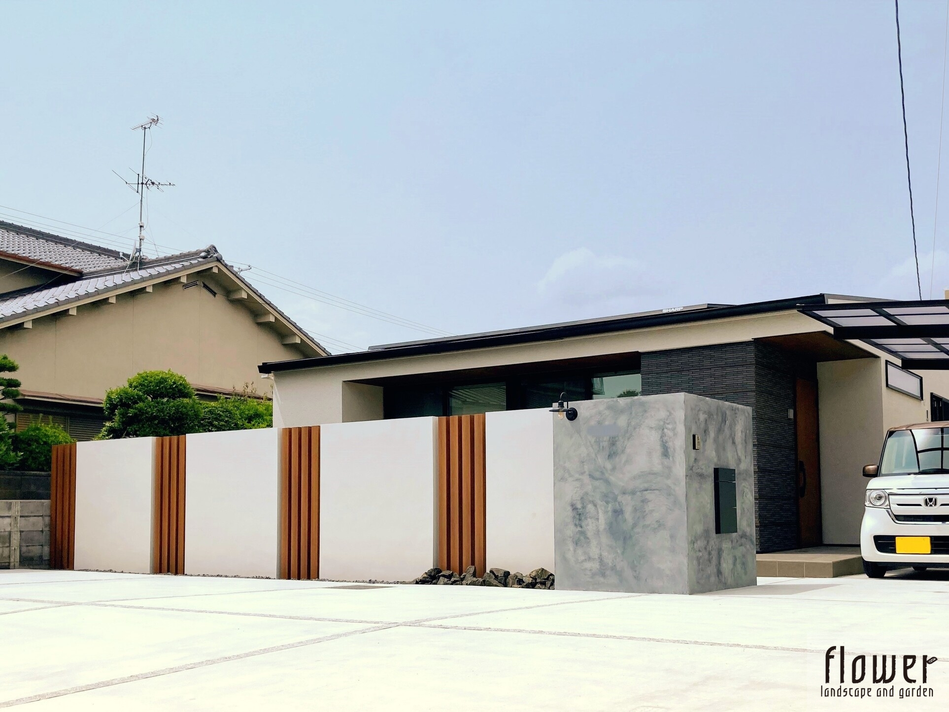 | コメント | 広くオープンな駐車場を確保しつつ、塀と角柱で視線をカット。 連続した門塀はL字型に設置し、正面からは表札と表明のみが見えるよう仕上げました。 目隠し裏のお庭には人工芝とウッドデッキを設置。 シンプルながらも、見る角度によって表情を変える外構に仕上がりました。 【使用部材】 宅配ポスト:ユニソン ヴィコDB100 アルミ角柱:三協アルミ マクリズム枕木材 カーポート:YKKap エフルージュFIRST ウッドデッキ:YKKap リウッドデッキ200 |