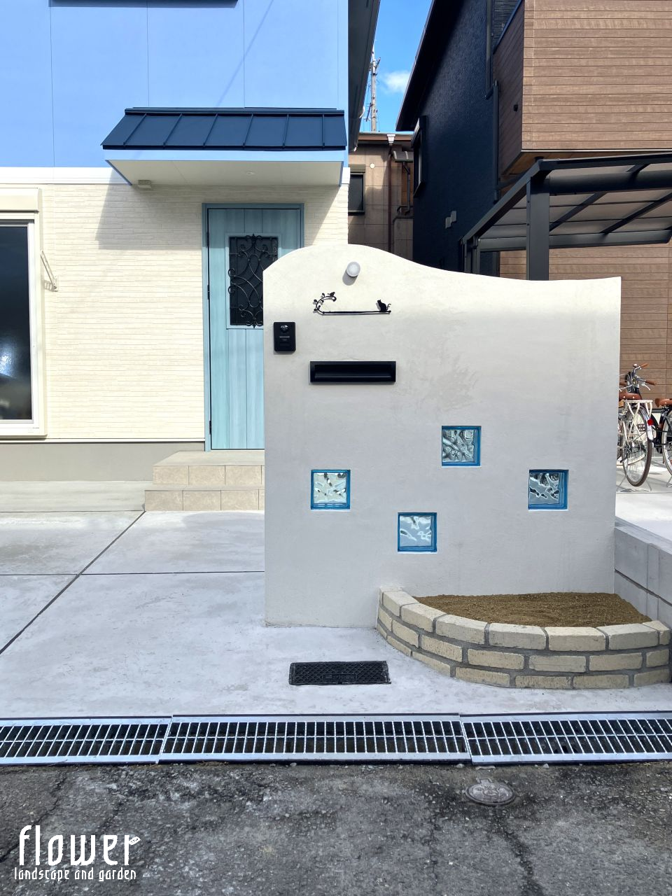 | コメント | ガラスブロックを埋め込んだ門柱は、 上部を波型にカットし 軽やかな曲線が印象的なデザインに。 門柱前には植栽桝を設け、 外構にやわらかな彩りと立体感をプラスします。 爽やかな色彩と透明感のあるガラス素材で、 ブルーの住宅の個性が際立つ マリンテイストの外構が完成しました。 【使用部材】 ・ポスト:LIXIL エクスポスト S-1型 ・メッシュフェンス:LIXIL ハイグリッドフェンスUF8型 ・カーポート:LIXIL ネスカR 1台用 ・塗装仕上げ:アイカ工業 ジョリパット ・レンガ:ユニソン ソイルレンガ210 ・ガラスブロック:オンリーワン クリスタルマリンブルー1910 ・300角タイル:LIXIL グレイスランド |